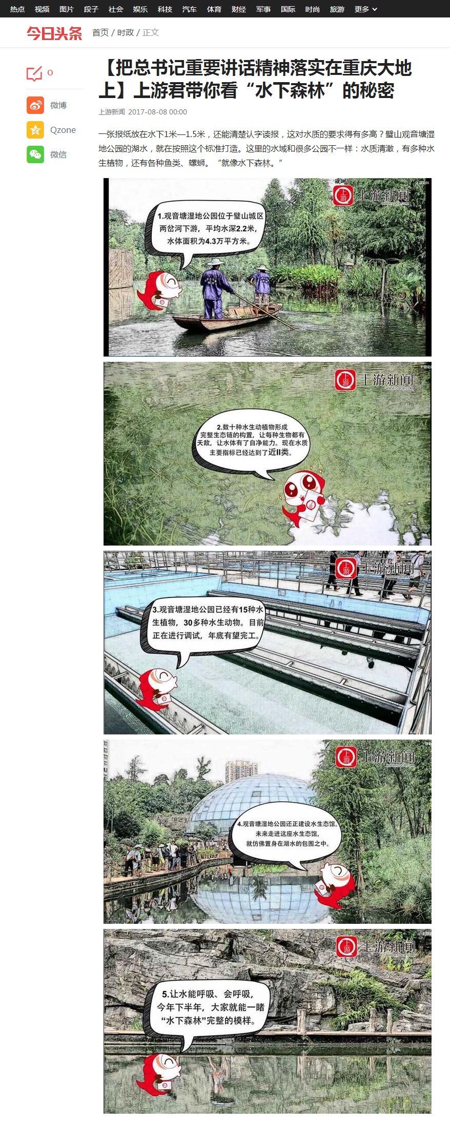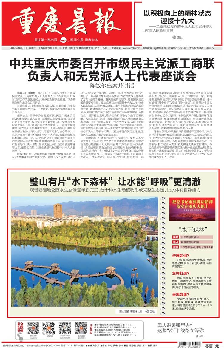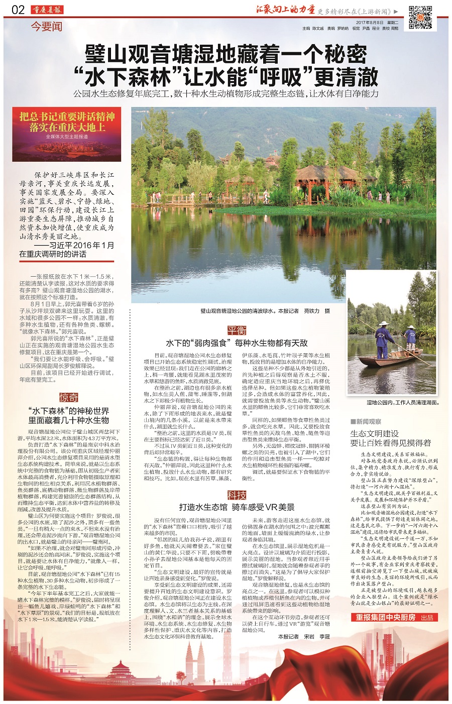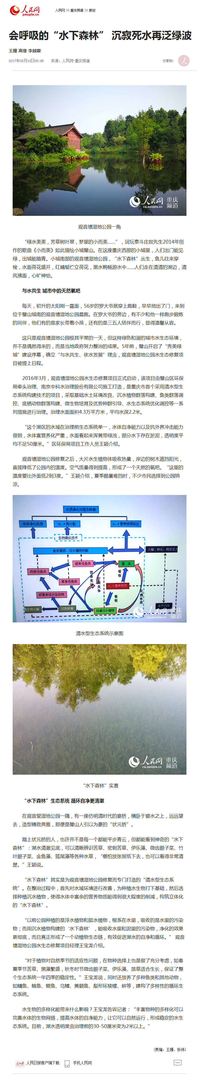 重慶日報(bào)、重慶之聲、重慶電視臺、重慶晚報(bào)、重慶晨報(bào)、重慶商報(bào)、華龍網(wǎng)、《當(dāng)代黨員》雜志社等市級主流媒體記者,來到觀音塘濕地公園,實(shí)地探訪了“水下森林”建設(shè)情況,采訪了項(xiàng)目設(shè)計(jì)施工單位【南京中科水治理股份有限公司】工作人員。觀音塘濕地公園項(xiàng)目是由中科水治理傾力打造的精品水生態(tài)修復(fù)項(xiàng)目,也是重慶市首個(gè)生態(tài)文明建設(shè)示范基地。