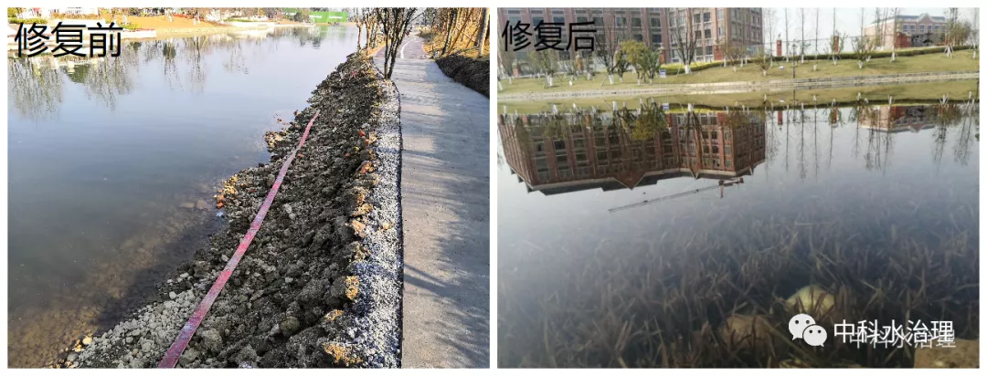 修復后:工程施工結束后,湖面水色正常無異味,水面無藻類、無浮萍、無垃圾、無臭味,水邊能清澈見底,水體透明度≥2.0米已上。水質主要指標(總氮、總磷)含量優(yōu)于國家《地表水環(huán)境質量標準》(GB3838-2002)地表水Ⅲ類標準。