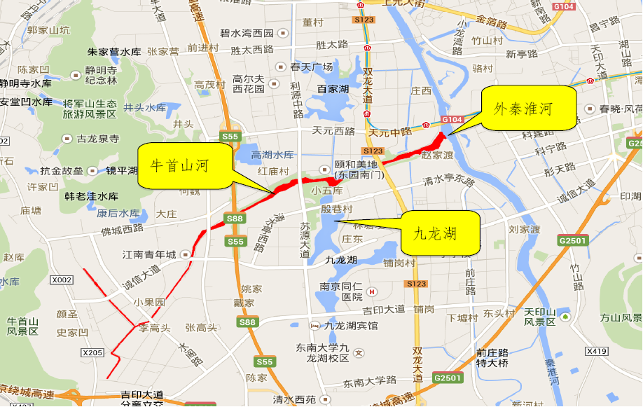 牛首山河總長約8公里,貫穿南京市整個江寧經濟技術開發(fā)區(qū)。沿岸有美麗的九龍湖公園和眾多高檔住宅小區(qū),是周邊居民閑暇散步垂釣的好去處。
