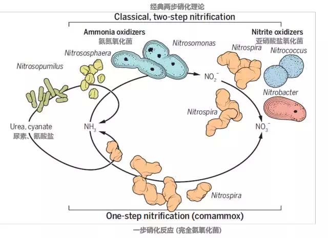 這個(gè)理論最先是由俄國(guó)微生物界傳奇維諾格拉斯基 (Sergei Winogradsky)早在19世紀(jì)末“成功”展示,他分離出了負(fù)責(zé)這兩步硝化的微生物,也就是所謂的AOB(ammonia oxidizing bacteria)和NOB(nitrite oxidizing bacteria)。但這個(gè)超過100年歷史的教條在2015年圣誕節(jié)前被英國(guó)明星科學(xué)雜志《自然》上的兩篇同日發(fā)表的題目雷同的文章和隨后一篇在美國(guó)微生物學(xué)會(huì)的文章終結(jié)了。三個(gè)科學(xué)團(tuán)隊(duì)發(fā)現(xiàn)了三種不同的培養(yǎng)[1,2]和一種非培養(yǎng)細(xì)菌[3]能夠各自進(jìn)行從氨氮到硝態(tài)氮的完全硝化過程。