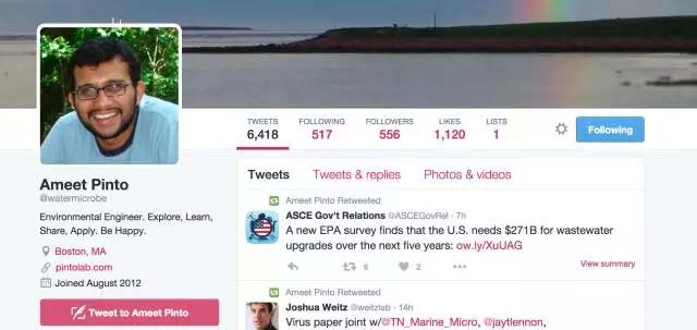 如果你的研究方向和他相似,盡可以跟他聯(lián)系,他的推特賬號(hào)是@watermicrobe,email是 a.pinto@neu.edu